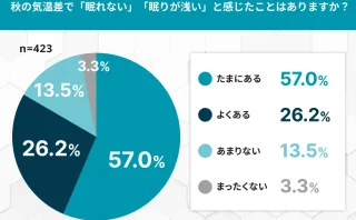 リリース 約8割が実感「秋は眠りが浅くなる」寒暖差と快眠に関する実態調査 ムーンムーン株式会社が運営する快眠情報サイト「快眠ランド」では、全国の20代〜60代の男女423名を対象に「秋の体調と睡眠」に関する意識調査を実施。その結果、約8割が気温差による“眠りの浅さ”を感じたことがあると回答し、秋の寒暖差が睡眠に与... 2025.10.13 リリース睡眠アンケート