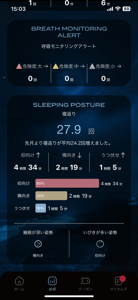 自分では寝ている間の姿勢を把握できないので、このデータはかなり貴重。