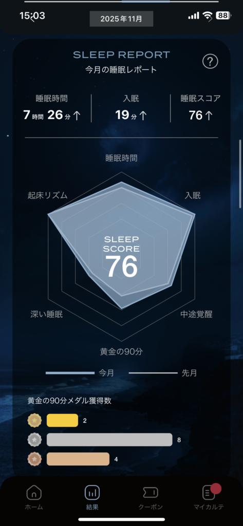 数値が行動をそのまま反映していて、「眠りは日中の過ごし方で決まる」という実感を強く持ちました。