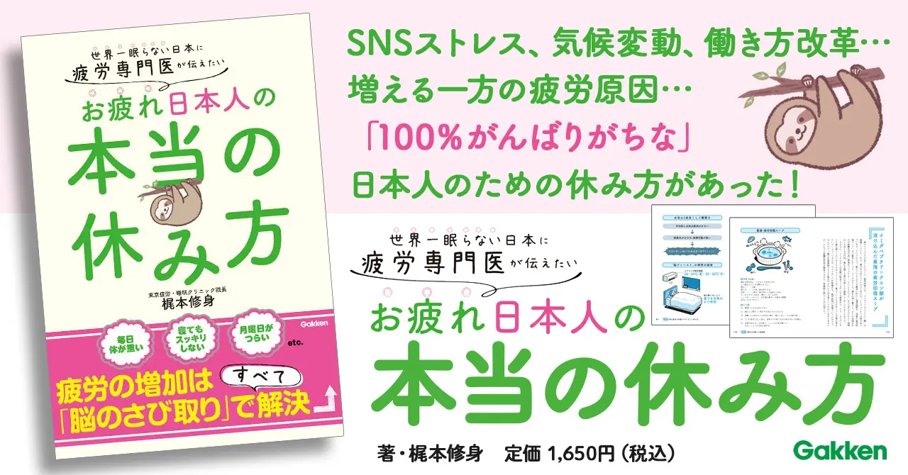 株式会社Gakkenは、疲労専門医・梶本修身氏による新刊『疲労専門医が伝えたい お疲れ日本人の本当の休み方』を2025年9月4日(木)に発売しました。本書では、日本人特有の疲労の原因を明らかにし、「脳ファースト」で休むことの重要性を解説。特に30〜40代女性に急増する「隠れ疲労」への対策を提示し、科学的に正しい休み方をわかりやすく伝えています。