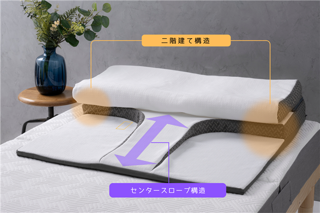 特長的なのは、cocochi factoryが独自に開発した「二階建て構造」と「センタースロープ構造」。横向き寝でも腕や肩が無理なく収まる”腕肩ポケット”を実現し、仰向け寝時には胸を自然に開き深い呼吸を促進。寝返りもスムーズに行える設計となっています。
