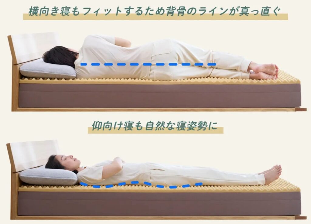 『suyara #001 Dots マットレス』は、体圧分散に優れた凹凸構造と、特許取得の「スマートスリット®」技術により、浮くような寝心地と寝返りのしやすさを両立。モチモチとした触感の上層と、しっかり支える下層の「ハーモニーウェーブ構造」を採用し、全身をバランスよく支えます。