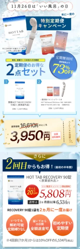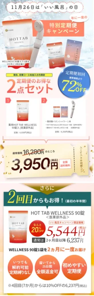 本キャンペーンでは、体温を1℃上げることが健康増進の鍵であるという理念のもと、年に一度の「特別定期便キャンペーン」を実施。2種の定期便コース(WELLNESS/RECOVERY)にて、初回限定でシャワーヘッド付き特別セットを72〜73%オフで提供し、自然入浴習慣のスタートを後押しします。期間は2025年11月21日〜12月7日まで。