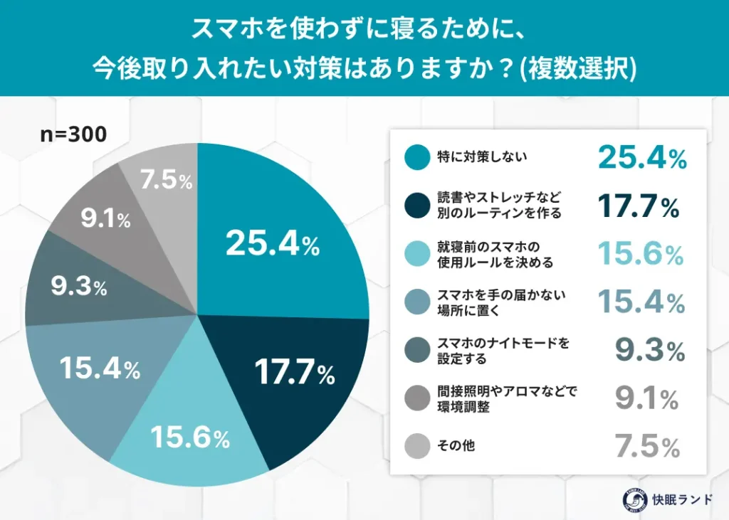 対策として最も多かったのは「特に対策しない」(25.4%)でしたが、一方で「読書やストレッチなどの別ルーティンを作る」(17.7%)、「スマホ使用ルールを決める」(15.6%)など、行動改善を試みようとする姿勢も見られました。