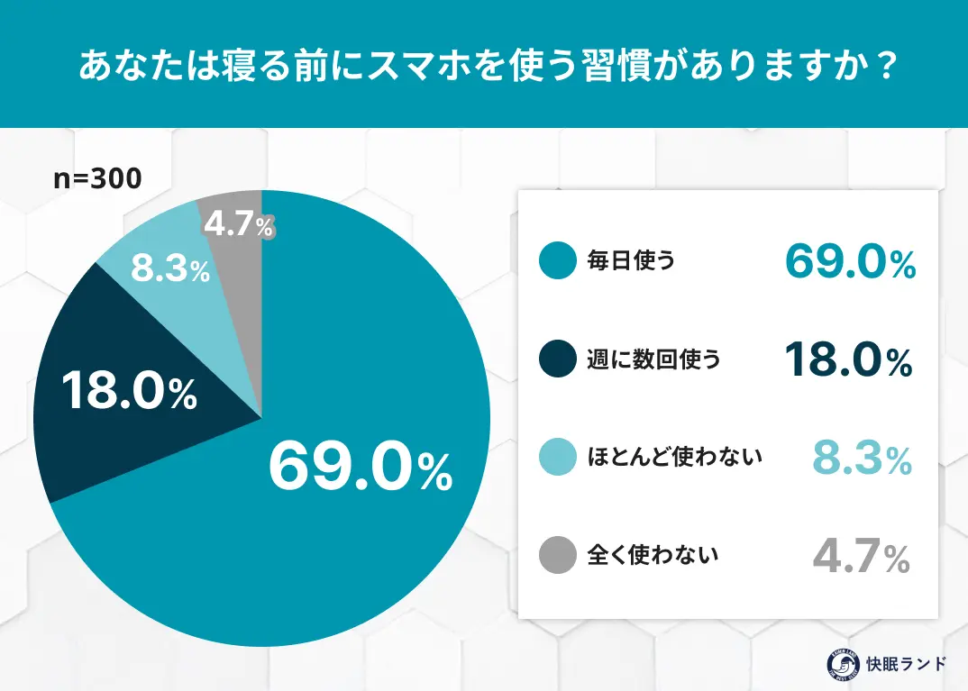 快眠メディア「快眠ランド」を運営するムーンムーン株式会社(本社:熊本県熊本市)は、全国の20代〜70代の男女300名を対象に、「寝る前のスマホ習慣と睡眠への影響」に関するインターネット調査を実施しました。調査の結果、約9割(94.0%)が「就寝前のスマホ使用をやめたいと思いながらもやめられていない」と回答し、睡眠の質への悪影響が自覚されつつも、強い習慣として根付いている現状が明らかとなりました。