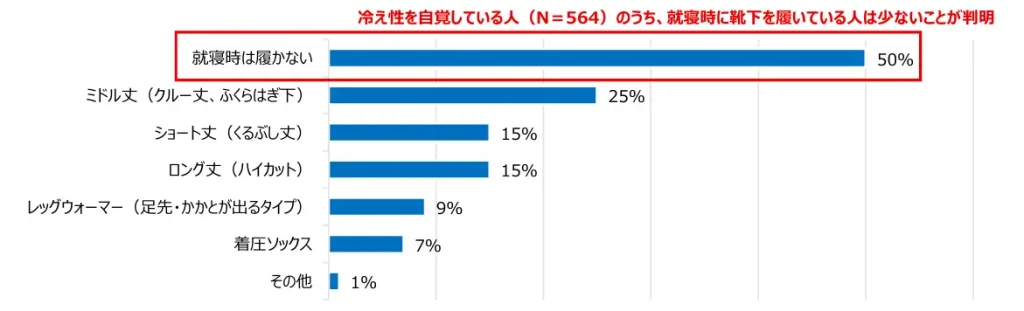 さらに、冷え対策として「靴下を履く」と答えた人は多いものの、そのタイミングは「冷えを感じた時」が多数派。就寝時に靴下を活用する意識の低さも浮き彫りになりました。