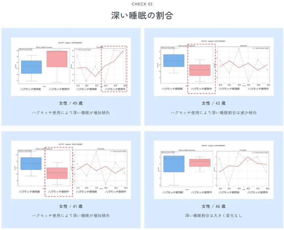 結果、「ハグモッチ」使用時は深い睡眠時間が増加し、睡眠の質の改善が脳波により裏付けられることが確認されました。