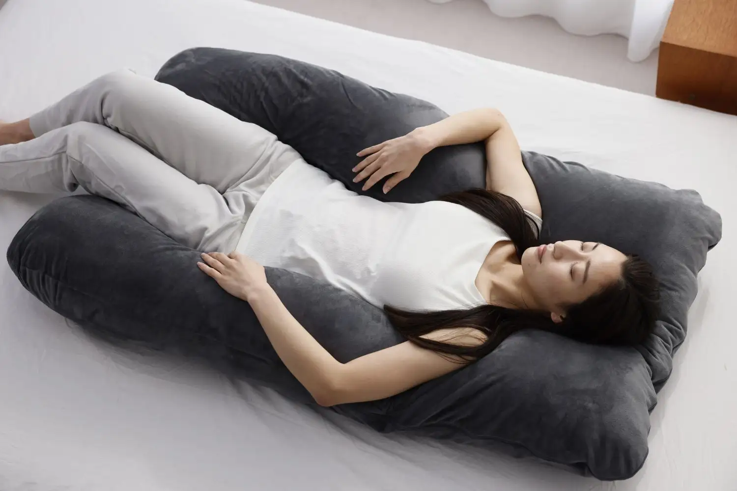 「ハグモッチ」は、自由な寝姿勢に対応し、横向き・仰向け・うつ伏せ・妊婦さんなど誰でも心地よいポジションで眠れるよう設計された多機能リラックス枕。