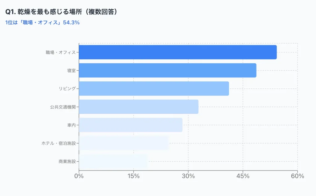 その結果、「最も乾燥を感じる場所」として54.3%が「職場・オフィス」と回答し、次いで「寝室」(48.7%)、「リビング」(41.2%)が続きました。特に職場における空調環境に対する不満が72.1%にのぼり、乾燥による肌荒れ経験者は6割を超える実態が明らかになりました。